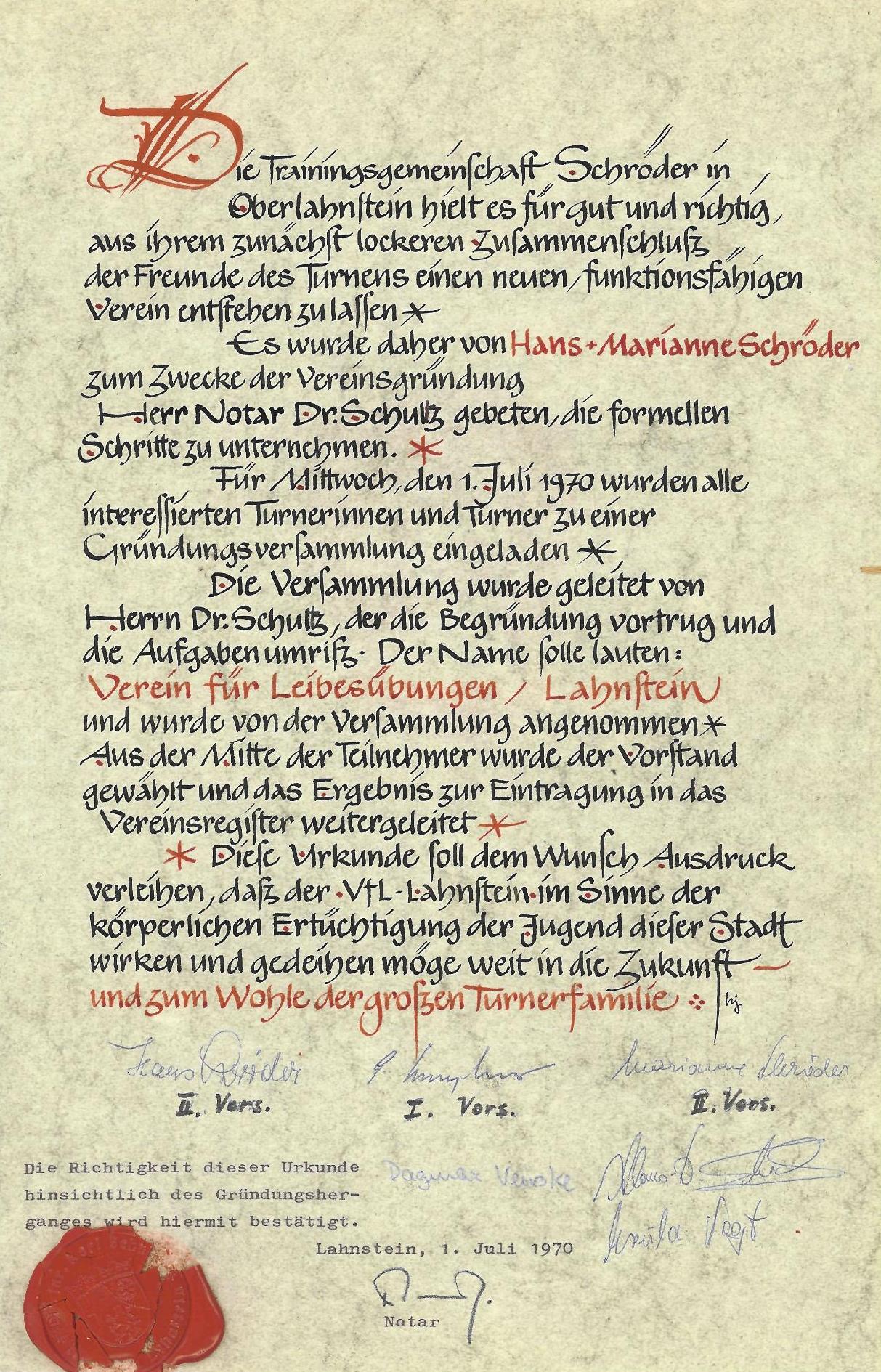 Die Gründungsurkunde vom 01. Juli 1970: